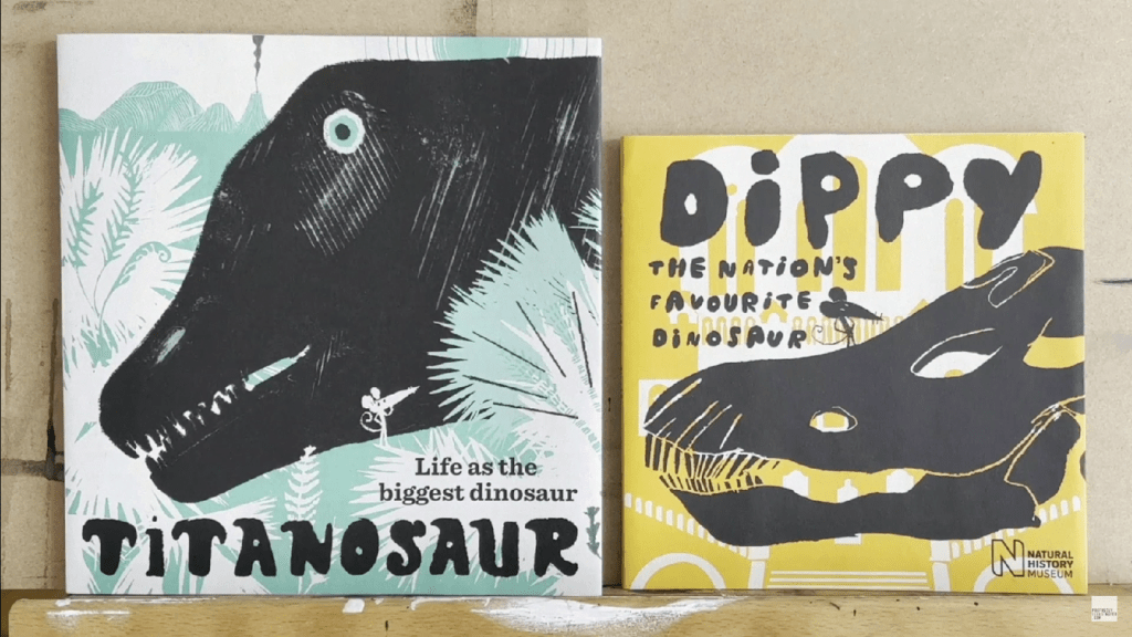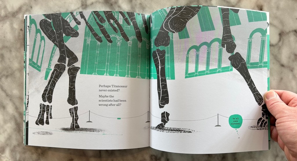 Forgive the tangent: returning to the matter at hand, Titanosaur: Life as the Biggest Dinosaur is a cute little story that’s easy to read, with pleasing, stylized illustrations. It shows admirable foresight on the NHM’s part to create a quality book like this to go with their temporary Patagotitan exhibit, which is a level of thought put into at least one aspect of their merchandise that I wish were more common in museum gift shops in general. (The entire exhibit seems to have an extremely high level of intentionality behind it. I will have the chance to visit it myself, soon, but in the meantime, check out Acheroraptor & Edaphosaurus‘ video about their visit to the exhibit to see some of its cool features! The NHM also published this book’s predecessor, Dippy: The Nation’s Favourite Dinosaur, in connection with its star’s brief return to the museum.) The other Patagotitan book I’ve reviewed, Titanosaur: Discovering the World’s Largest Dinosaur, contains more information about its star, but this one makes for better family reading time. Indeed my six year old elected to take it to bed the other night, so I’d say that’s a better recommendation than any I could give! I shall of course give my own two cents anyway, and give Titanosaur: Life as the Biggest Dinosaur my Dino Dad Stomp of Approval.