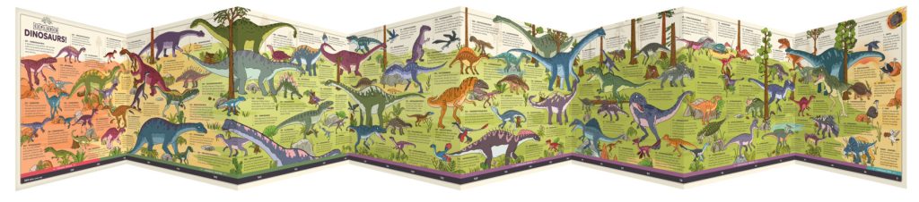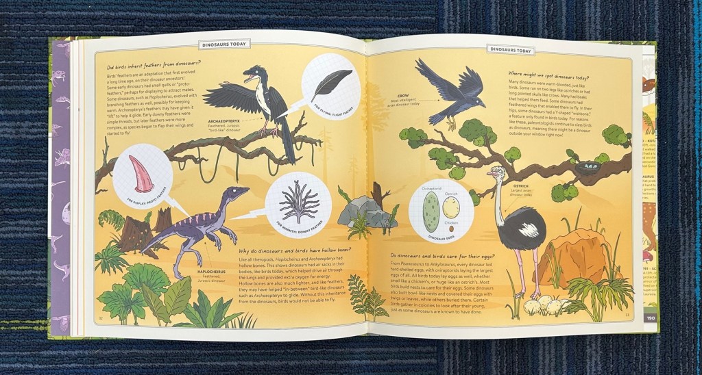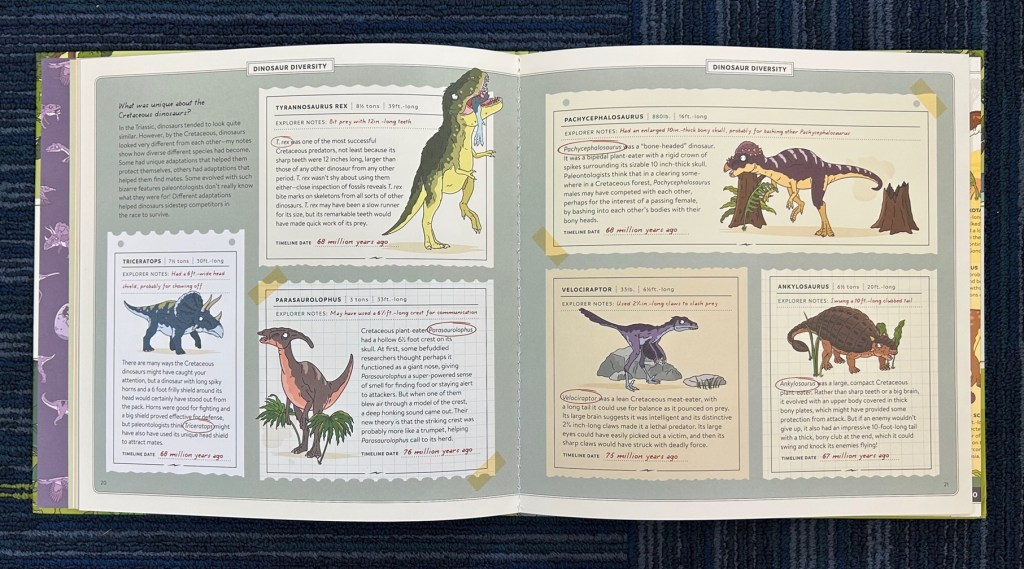 As with all the “What On Earth?” books I’ve reviewed thus far, Dinosaurs! Explorer includes a large fold-out timeline (though of course not as massive as A Brief History of Life on Earth!) that displays the Mesozoic, with several dozens dinosaur species placed roughly at the location in the timeline in which they lived. There’s a token sliver of the Cenozoic, showing a few modern birds, but I really feel like science books need to start emphasizing the continuing history of dinosaurs beyond the End Cretaceous. Far from scrappy remnants of a has-been lineage, birds are a testament to the continuing legacy of their Mesozoic forebears, and emphasizing that legacy has the potential to increase appreciation for our modern ecosystems as well.