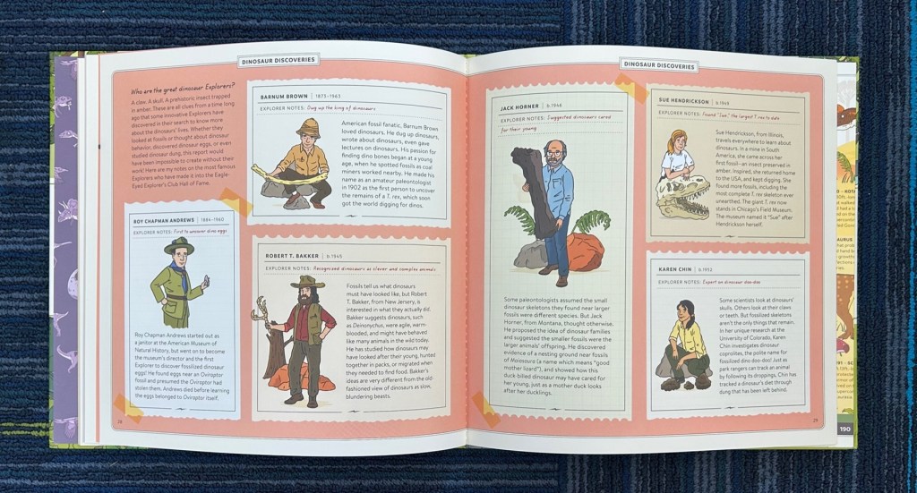 One feature I’ve always appreciated about the “Explorer” is the dedicated page for important individuals in the history of the relevant field of study. In this case, we have Roy Chapman Andrews, Barnum Brown (who has his own Amoeba People ballad), Bob Bakker, Jack Horner, Sue Hendrickson (discoverer of Sue the T. rex), and Karen Chin (who has her own entire page in Daring to Dig). I feel like this humanizes the field of paleontology in an important way, as knowing actual individuals inevitably helps make the reader feel more deeply connected to the subject.