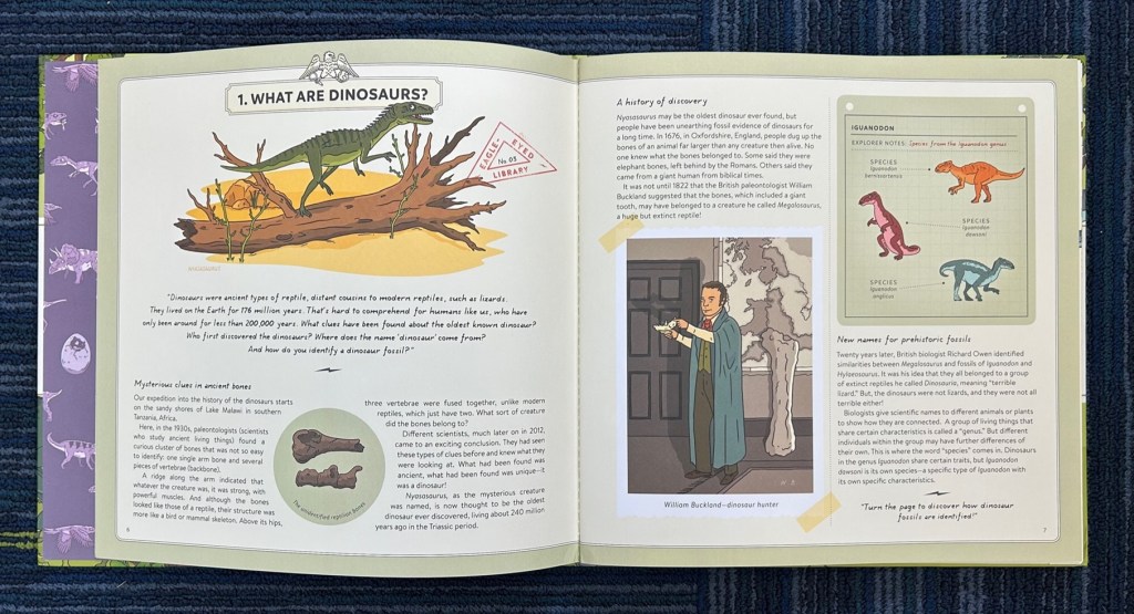 Four whole years after I first started reviewing books in the “What On Earth? Explorer” series, I’m just now finally getting to the original book on dinosaurs! Written by Nick Forshaw, and illustrated by Andy Forshaw, Dinosaurs! Explorer is presented as the journal of Eric Eagle, Senior Librarian of the Eagle-Eyed Explorer Club. As with the other books in this series (which include include Bugs! Explorer, Mammals! Explorer, and Plants! Explorer), it doesn’t feel like it fully commits to the field journal aesthetic, as it is formatted in a fairly standard fashion, just with occasional faux “tape” appearing to stick some of the pictures to the page, and only occasional instances of notations done in a more “handwriting” type of font.
