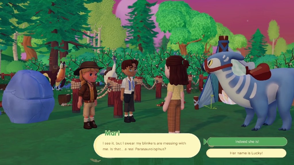 The game starts with a short vignette depicting the player helping to hatch and raise their first dinosaur, Lucky the Parasaurolophus. As they outgrow their childhood home, they choose to start a new life in Paleo Pines, a region with several varied environments to explore. While not quite as detailed of a world as that in Zniw Adventure, there is some backstory and worldbuilding for players to discover here, too. The locals begin making friends with the player, particularly via various tasks they need help with, and they in turn help the player solve a bit of a mystery.