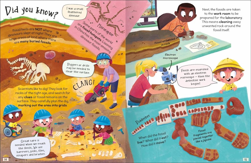 “Fossils” is very similar to “the other one “Prehistoric Animals”, but with, of course, a tighter focus on fossils as such. This works to this book’s advantage in that it makes it feel a little more organized than its somewhat haphazardly arranged counterpart. Each page of the book is specifically themed around different types of questions that can be answered by fossils.