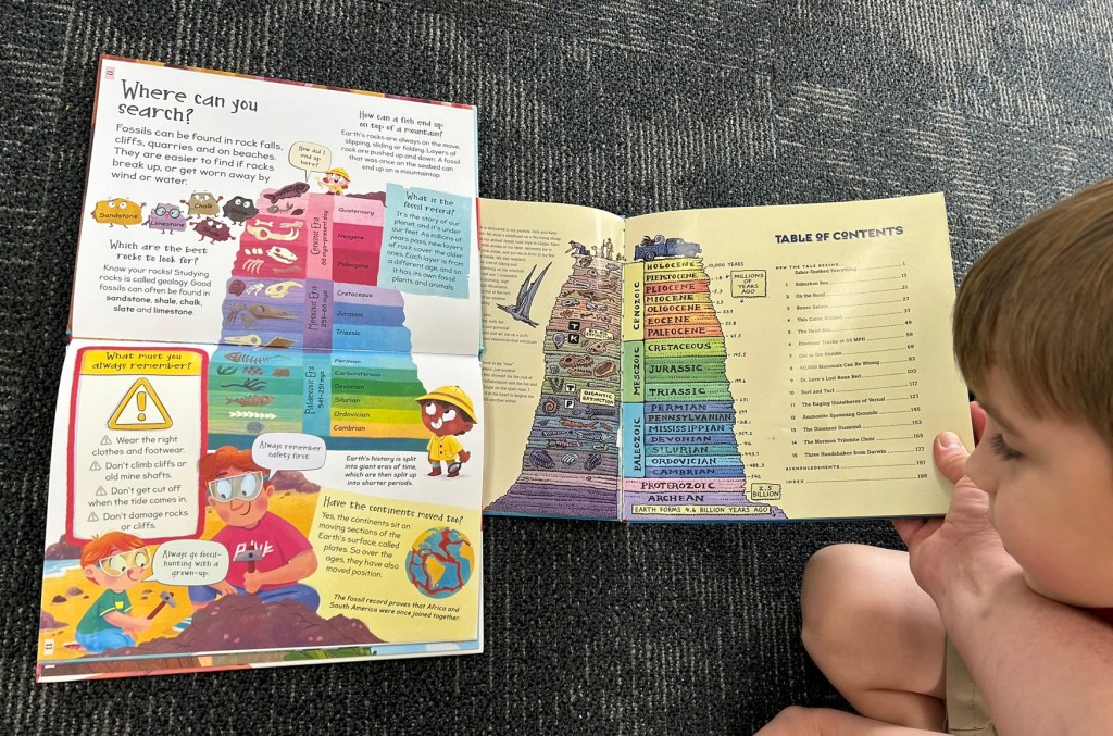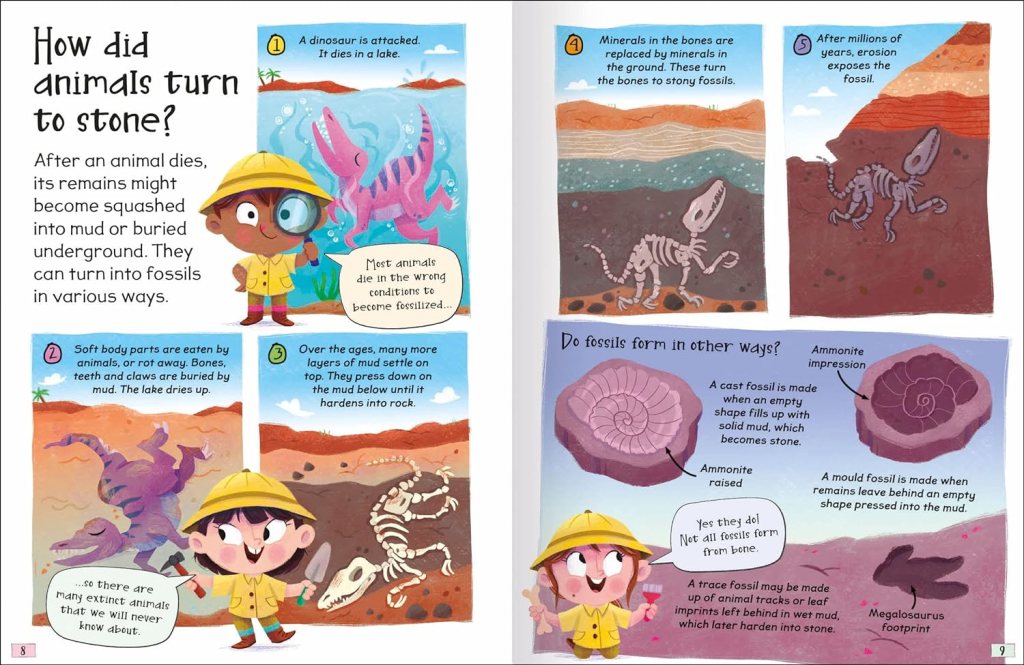 When I first came across Curious Questions and Answers About Prehistoric Animals at my local bookstore, I was dimly aware of having seen its illustration style used for other books, but I had no idea there were more prehistoric themed books in its series! Here, I will take a look at the one that might seem redundant when taken together with its companion, but I would argue is the better of the two: Curious Questions and Answers About Fossils.