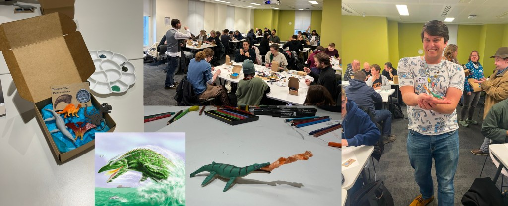I might have been able to squeeze a few more lectures into my schedule, but apart from missing an hour or two of Sunday that also kept me from the Lost World (1925) and Prehistoric Planet watch parties, I kept myself occupied by spending a good chunk of time in the paleoart workshops! The most engaging activity in this track was James Pascoe‘s “Paint A Pliosaur” event, a separately ticketed session in which several dozen people got to paint their own 3D printed pliosaur model that James provided. I got a bit cheeky with mine, and tried to base it off a creationist illustration I saw in a book I had as a kid, though I got the design a bit wrong! I did like how my paper fire turned out though! (For those not as deep in the weeds as some of us, many creationists like to claim that the Biblical Leviathan is a prehistoric creature of some sort. The flame-throwing Parasaurolophus is the most famous version of this idea, though Ken Ham also commissioned a lesser known illustration featuring a Kronosaurus in the role, inspiring my own creation.)