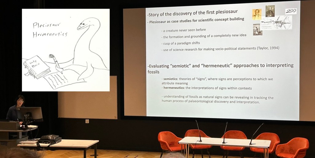 Judyth Sassoon honoured the 200th anniversary of the discovery of Plesiosaurus with a talk on how it interacted with and changed the symbolic landscape in the era of its discovery. I had only ever heard the term “hermeneutics” in the context of Biblical commentary before, inspiring my little doodle I added into the corner of my photo here.