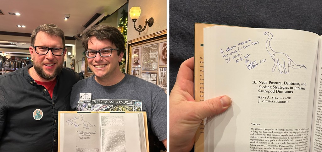 This of course applies to the man of the hour, himself! I am still flattered that Darren was just about as happy to have me there as I was to attend. I indulged my inner autograph hound and enacted a silly idea I have had for some time: having him sign Stevens & Parrish’s entry in Thunder-Lizards about sauropod life posture with a reference to his own paper with Taylor & Wedel that responded to it. Trust me, it’s (almost) funny if you’re in the know.