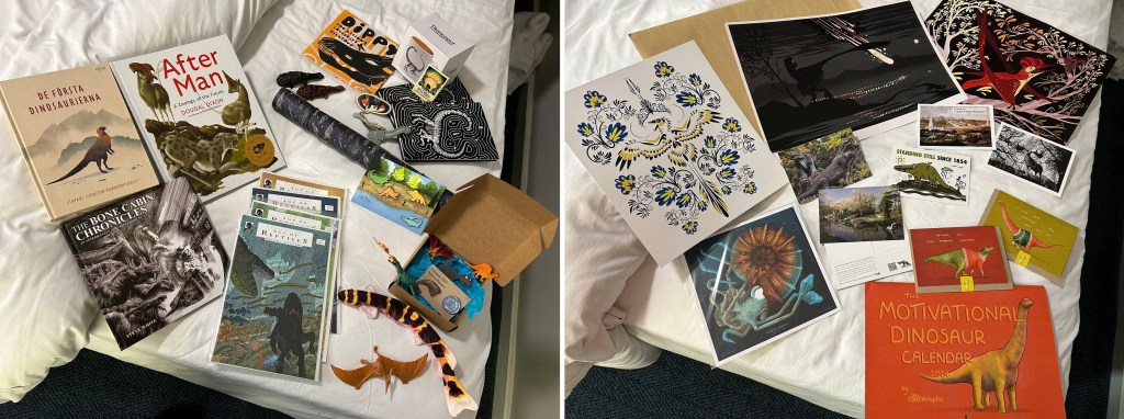 In addition to some goodies from the NHM gift shop, I got myself a copy of De första dinosaurierna by Stavros Kundromichalis, an anniversary edition of After Man by Dougal Dixon, The Bone Cabin Chronicles by Steve White, Friends of the Crystal Palace Dinosaurs pins & postcards, a Kuhli Loach by perfect-attendance champion Palaeoplushies, my Pliosaur as well as some comics gifted to me by James Pascoe, art prints from Natalia Jagielska, wrapping paper and an ammonite print from Emily Higgs, and cards and a calendar from Em the Cookieraptor.