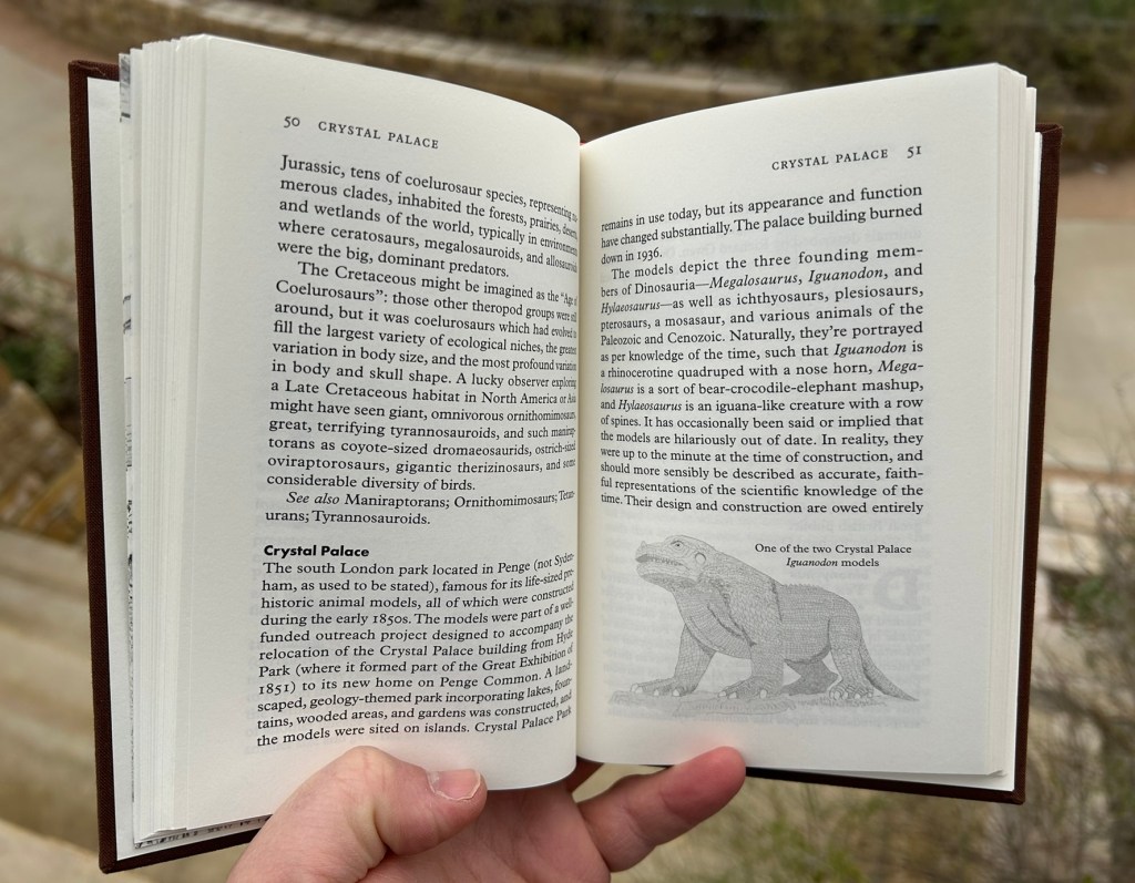This first thing that jumps out at me when reading this book is how it fits the format of a “typical” or “classic” encyclopedia much more than any other so-called “encyclopedia” I’ve reviewed thus far, including Don Lessem’s similarly named Ultimate Dinopedia, which Darren also advised on. That’s despite this book’s small physical size allowing it to function as a sort of handbook, as well, making it highly portable. Indeed, some of the letters are already beginning to rub off the front cover of my copy due to how much I’ve carried mine around with me!