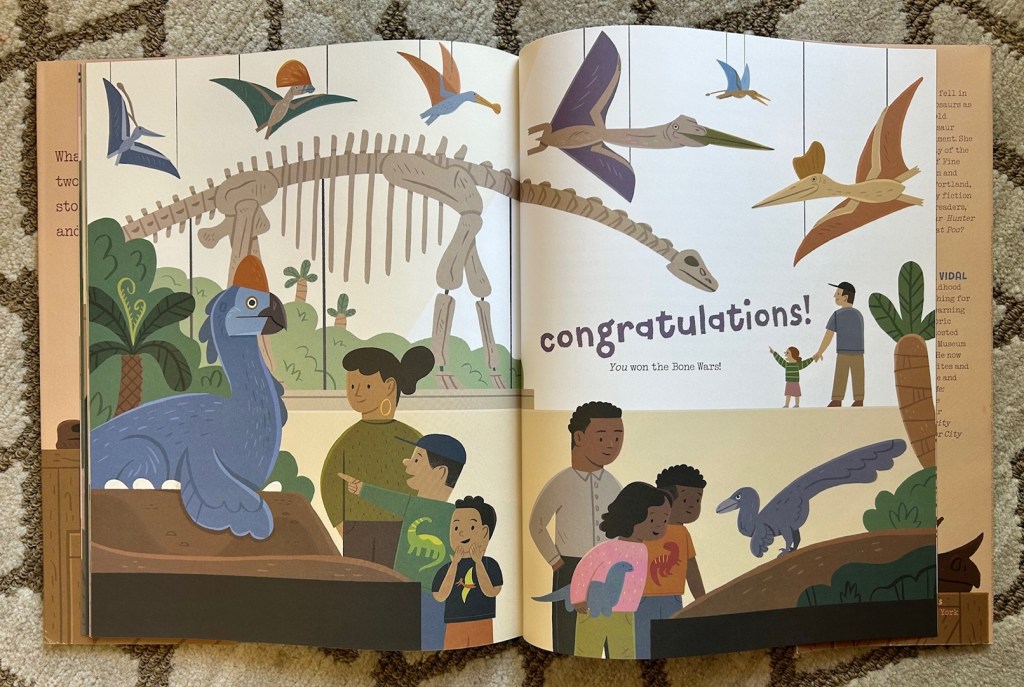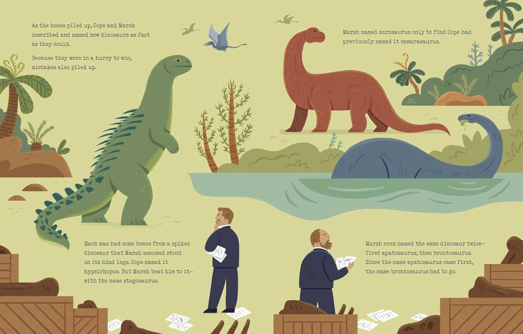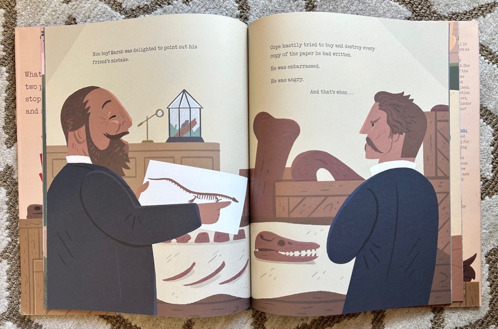 An author’s note and an illustrator’s note at the end explain some of the creative choices made in making this book, including possible over-simplifications and omissions, providing a bit of extra context that might aid those interested in further learning. In that way, readers can springboard from this book the way science grew out of the often messy legacy of Cope & Marsh. As Kurtz writes, while neither man can really be said to have “won” the Bone Wars, in a way, it’s really the rest of us who have, with the mountains of fossils and the interesting questions they left behind serving to boost ongoing research even into the modern day.