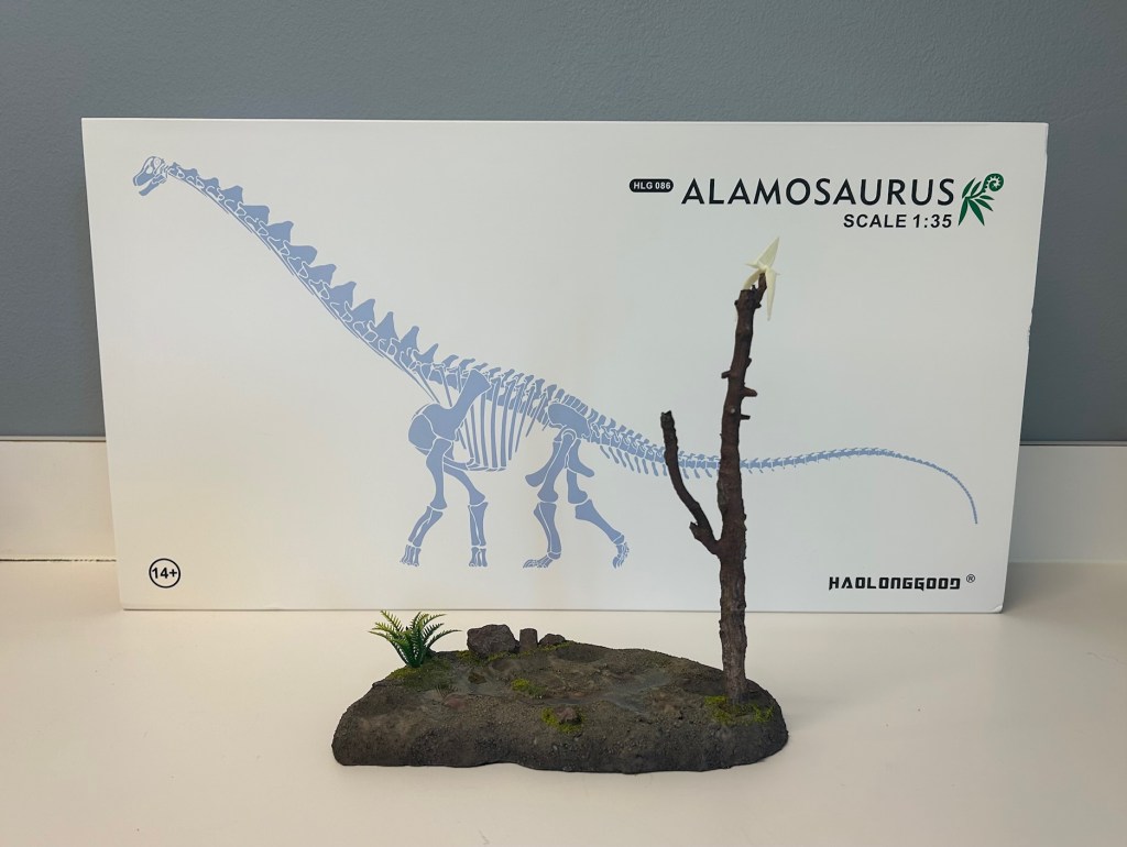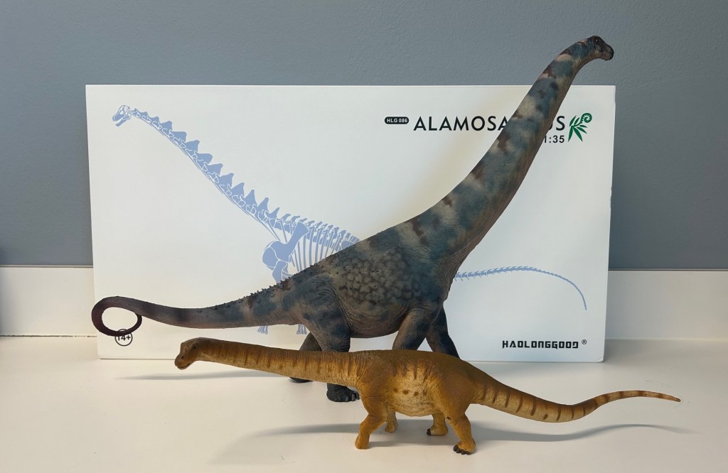 I’ve mentioned in my other model and toy reviews that I’m the kind of nerd that likes to keep all his models roughly in scale with each other, which means I generally try to keep them between 1:35 and 1:40 in scale. This unfortunately (or fortunately, for my wallet!) limits the availability of species to me, meaning smaller dinosaurs and even many medium sized mammals are rare finds. What might come as surprise, however, is that the largest dinosaurs are also rare to find at this scale, given the sheer size of the largest sauropods. Haolonggood is among the happy few willing to take a chance on these enormous figures, and given us their Alamosaurus in glorious 1:35 scale!