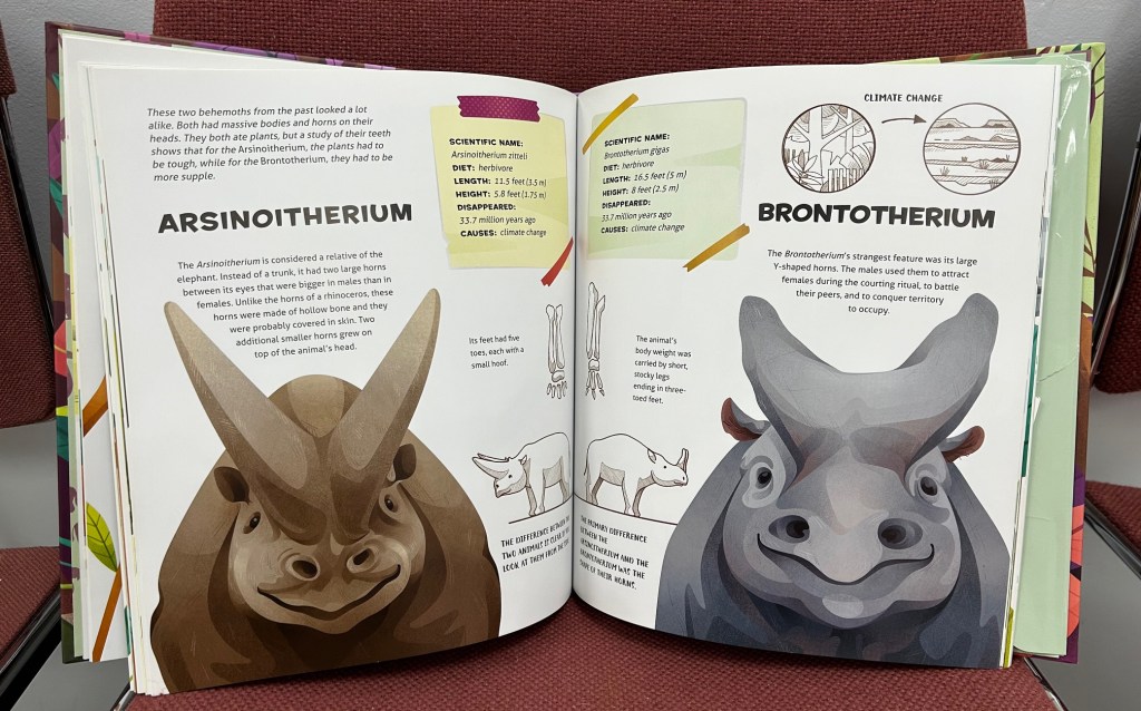 Weird and Wonderful Extinct Animals contains a mix of mostly ancient, but also some recent, bygone creatures. There’s little order to the arrangement: “modern” extinctions are clustered towards the end of the book, except for Dodo and Thylacine, which are at the very beginning. I suppose the creators were relying on their popularity to draw readers in, though I’m not sure why grouping them with closer contemporaries wouldn’t have worked just as well. Occasionally, some of the creatures are also paired with relatives or otherwise comparable animals in the same double-page spread, in order to highlight their similarities and differences. This generally doesn’t extend beyond a couple pages, however, as closely related animals can also be found at far opposite ends of the book as well.