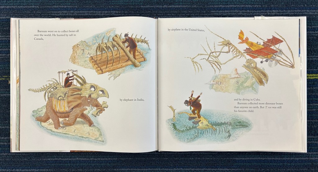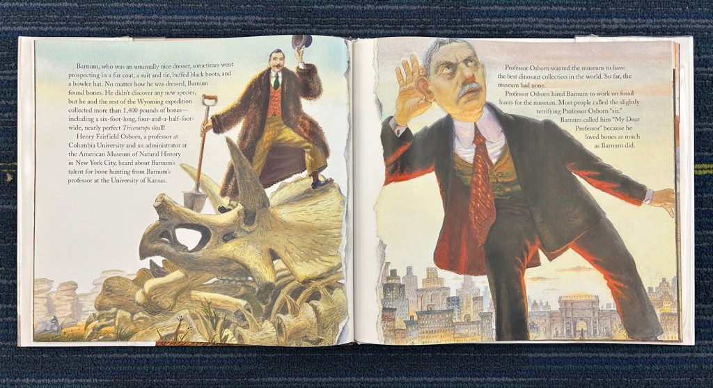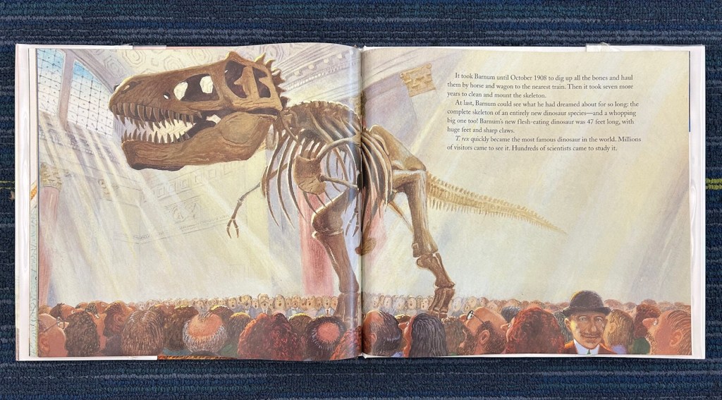 Barnum’s Bones (written by Tracey Fern and illustrated by Boris Kulikov) features some key points of Barnum Brown’s career, focusing primarily on the period leading up to the discovery of Tyrannosaurus rex. Barnum’s early field expeditions are briefly discussed, including his last-minute expedition to Patagonia to collect mammal fossils. I feel like more could have been said about the interesting things that happened on this particular expedition, but with T. rex as the secondary focus of the book, I suppose it makes sense not to get too sidetracked. I liked how the author conveys Brown’s dedication through tough conditions, both in searching for and actually excavating his fossils. The reader gets a good sense of the hard work, and the rewarding payoff, of these field expeditions.