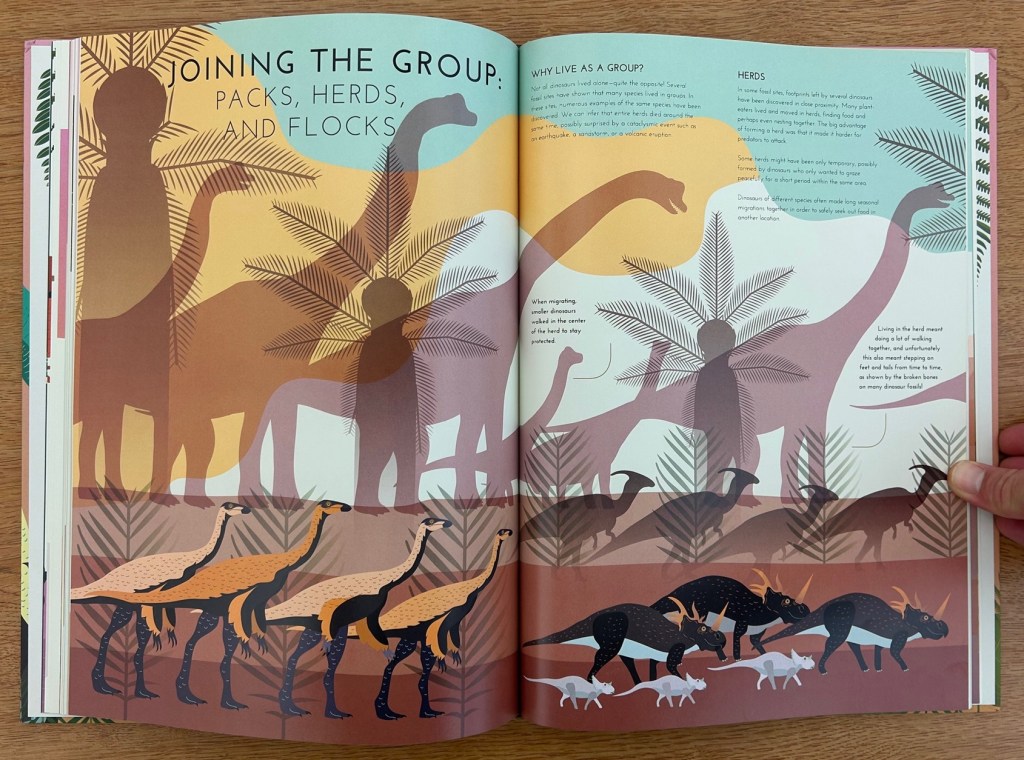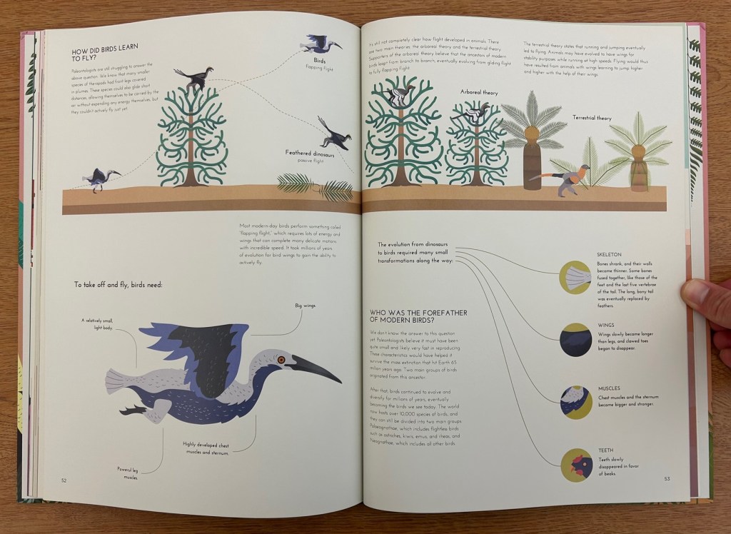 The text also seems to be under the apprehension that birds somehow evolved “out of” or “away from” being dinosaurs, when in fact they are still dinosaurs every bit as much as a T. rex. When defining dinosaurs as a group on page 6, the author states that “no dinosaurs flew”, and that nothing outside of the Mesozoic Era can be considered a dinosaur. This despite a fairly decent (if somewhat muddled) look at bird evolution and the development of flight later in the book.