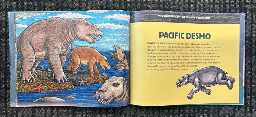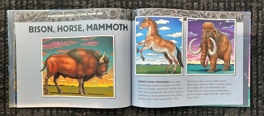 Later in the book, we also see some of the Cenozoic residents of Alaska, from fossil palm trees, to the desmostylian Ounalashkastylus. More familiar creatures like the bison, horse, mammoth, walrus, and polar bear also feature.