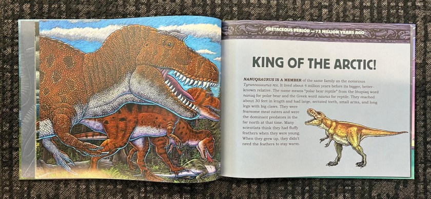 I would have also liked to see some more entries for Cenozoic life. In this one arena, Alaska Dinosaurs does not completely supplant Thunderfeet, which devoted as much or more space to Pleistocene animals as it did to the dinosaurs. This book would have felt just that much more well rounded if it had similar balance in the creatures highlighted. On a similar note, I personally might have enjoyed a little more detail in the writing in general, though I suppose it does well enough for the target audience.