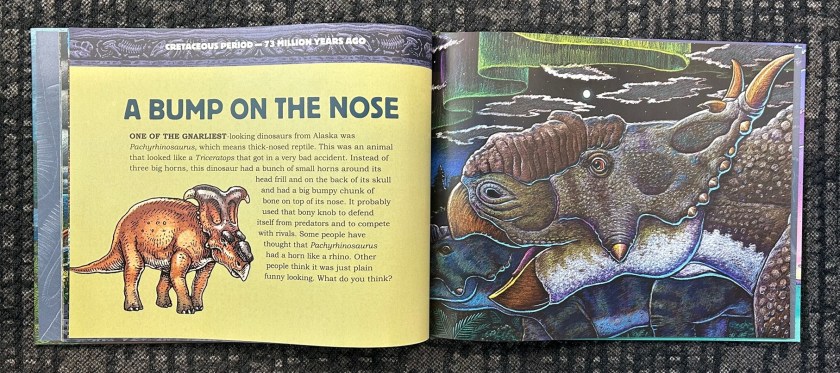 Alaska Dinosaurs can in some ways be considered an update or successor to Thunderfeet, another book on Alaska’s prehistory that I have also reviewed. The two books have a broadly similar format, but Troll’s book benefits from a significant increase in our knowledge of Mesozoic Alaska in the years since Thunderfeet‘s publication. Here we get to meet the likes of Nanuqsaurus, Pachyrhinosaurus, and Ugrunaaluk (even if some think it might just be an Edmontosaurus), among other lesser known dinosaurs like the lambeosaur featured on the cover.