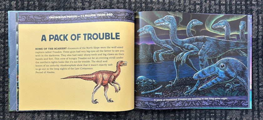 Overall, I really liked this book, and I am always keen to have more of Ray Troll’s work in my collection! I highly recommend this book to any youngsters interested in polar dinosaurs and Alaskan prehistory. Be sure to check out some of my other reviews I’ve linked to above, and visit Ray Troll’s web store for more of his artwork!