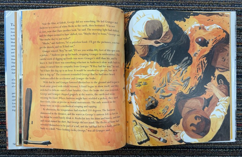 Floca provides lovely paintings for each page of the book, ranging from broad panoramas to closeups of the excavations. Reconstructions of some of the dinosaurs discovered also appear at the end of the book and on the inside covers. The raptor dinosaurs are unfortunately depicted as scaly, but as this book came out in 2000, it is somewhat excusable given the prevailing paleoart conventions at the time.