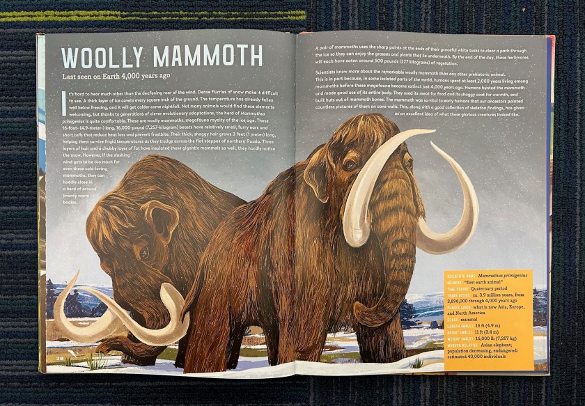 Overall, I really like Meet the Megafauna. It covers a broad variety of megafauna, with all of the classics one would expect to appear in a book like this. The minor mistakes I mentioned aside, it has excellent information, and pleasant illustrations. I think I feel comfortable giving this one my Dino Dad Stomp of Approval. For books with a similar theme, see my reviews of Once Upon A Mastodon, Mammal Takeover!, Mega-Predators of the Past, and Stone Age Beasts.