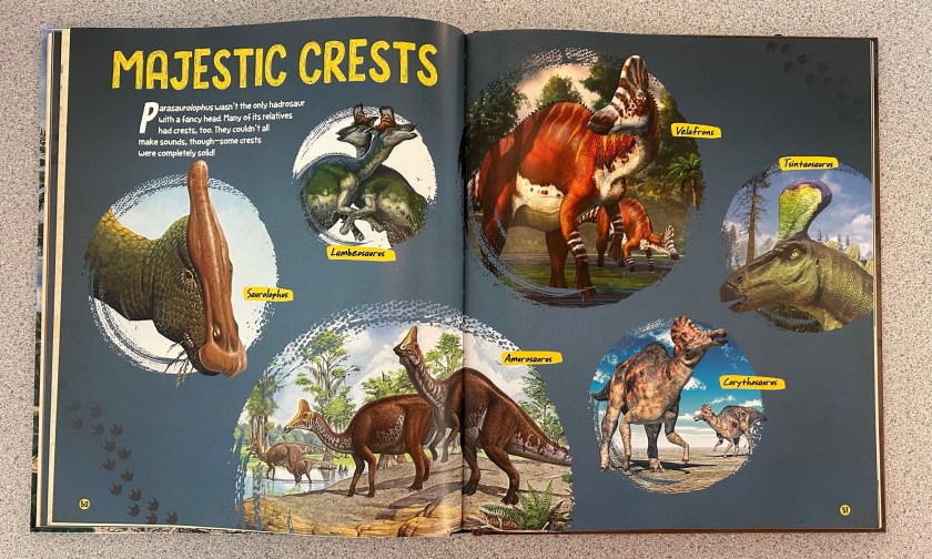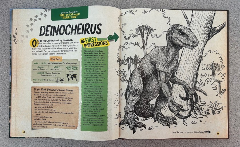 Almost every dinosaur gets a set of these contrasting before-and-after set of illustrations, with the text describing scientists’ “First Impressions” of the dinosaur in question, followed by “What We Know Now”. It’s a very thorough way of describing each dinosaur in a limited amount of space, and gives a great sense of the history of study. In this way the book covers vaguely similar ground to Boy, Were We Wrong About Dinosaurs!, but for a somewhat older, more detail-oriented audience.