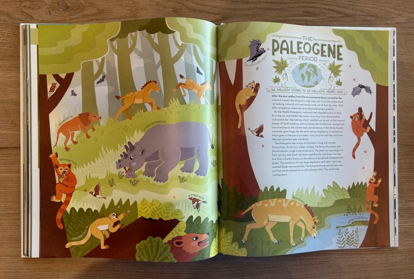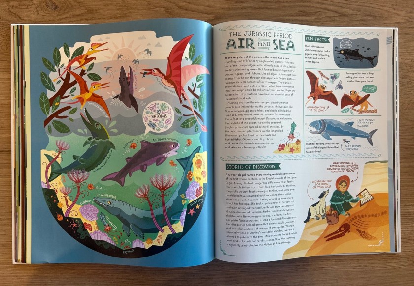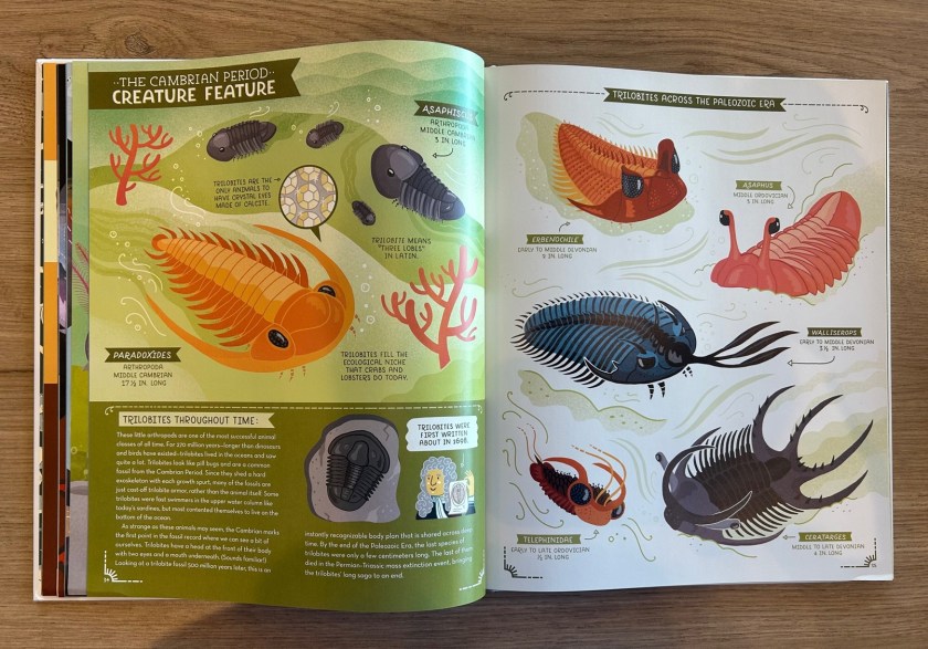 Happily, Ignotofsky has since released an entire book on paleontology, titled Dinosaurs: Exploring Prehistoric Life and Geological Time. It’s fairly dense for a children’s book, going into great detail on various topics in paleontology, all arranged chronologically according to geologic time. Despite “Dinosaurs” getting top billing in the title, this book is about so much more. It’s very much an “and other prehistoric creatures” sort of book, featuring plenty of lifeforms not only from the Mesozoic, but other eras in Earth’s history as well.