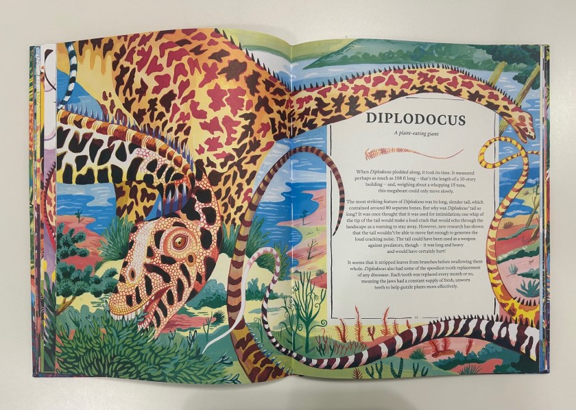 The illustrators have delivred lightly stylized artwork in bright, almost psychedelic colors. If I were to describe the style, I would say it feels a bit like a mashup of the works of Clémence Dupont and Luis V. Rey, with Dupont’s stylization and Rey’s color sensibilities. Some of the reconstructions seem a little more rigorous than others, but on the whole they look pretty good. I did notice a Postosuchus that seems to have been traced from a photo of the Schleich toy, which I have to take marks off for.
