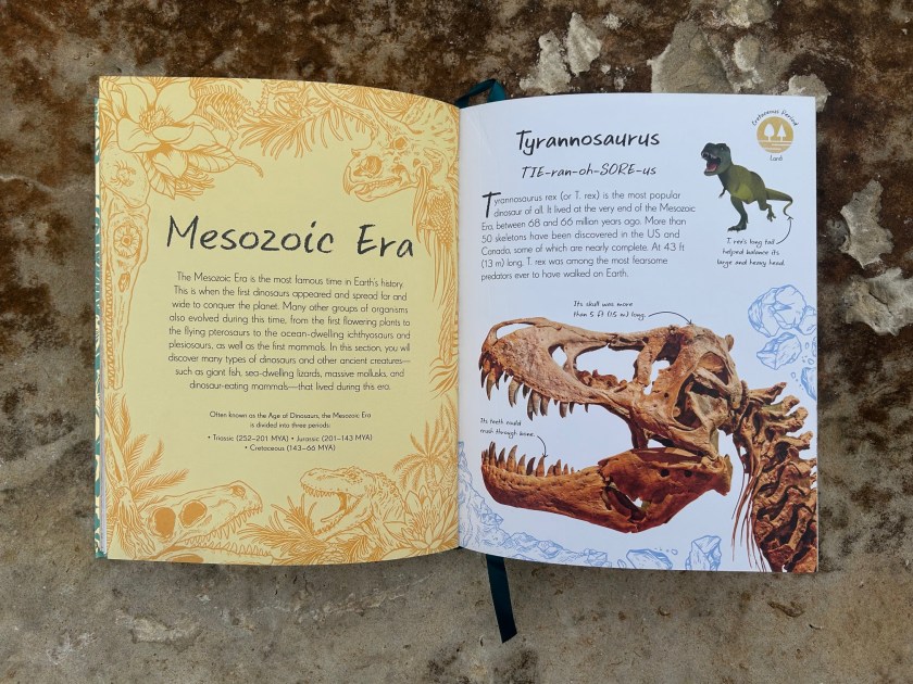 The content and format of An Anthology of Fossils reminds me strongly of Dinosaurs and Other Prehistoric Life. They both feature organisms from throughout Earth’s history, organized by whether they fall into the Paleozoic, Mesozoic, or Cenozoic Eras. The organisms depicted are not necessarily listed chronologically within those eras, however.
