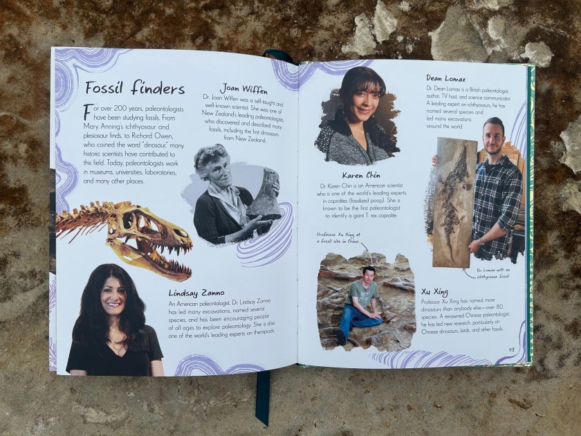 The creature profiles are occasionally interspersed with short interstitials that touch on broader topics within paleontology. For example, one highlights important fossil sites, while another showcases some famous paleontologists.
